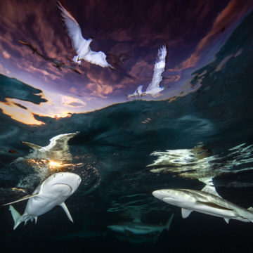 Renee Capozzola hat ein Bild von Haien und Seevögeln aufgenommen – es schaut so aus, als ob die Tiere miteinander tanzen würden