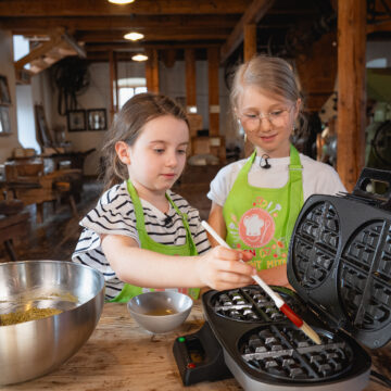 Und jetzt zeigen dir Theresa, Alva und unsere Köchin Sandra Kollegger, wie du dir Waffeln mit Kürbiskernöl machen kannst: